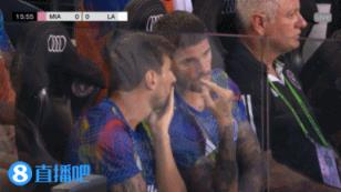 第16分钟,镜头给到迈阿密国际替补席,德保罗正在和梅西交流↓