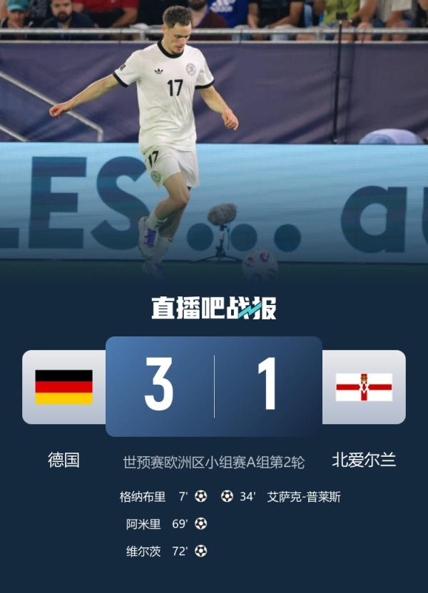 世预赛欧洲区小组赛A组第2轮,德国3-1战胜北爱尔兰,格纳布里、维尔茨进球。