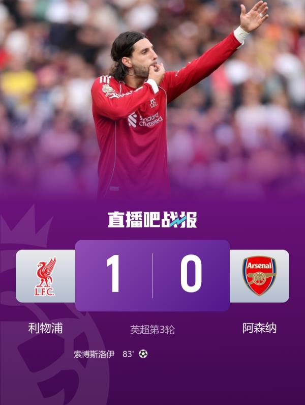 英超第3轮,利物浦1-0阿森纳!索博斯洛伊83分钟任意球世界波制胜!