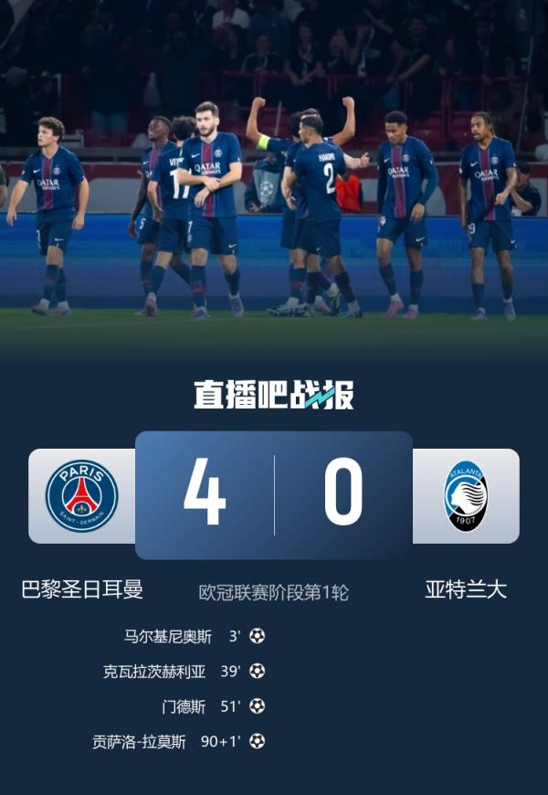 开门红!巴黎4-0亚特兰大 马尔基尼奥斯闪击K77破门巴尔科拉失点