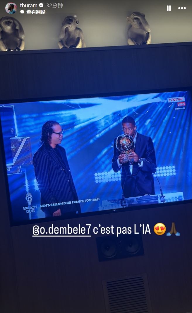 小图拉姆在家看登贝莱获得金球奖,晒照配文:这不是AI生成的 9月23日讯 在登贝莱获得2025年金球奖后,他在法国队的队友小图拉姆更新了社交媒体。小图拉姆晒出了自己在家看登贝莱获颁金球奖的照片,配文写道:“这不是AI生