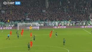 比赛第52分钟,国安进攻,塞尔吉尼奥禁区右侧横扫门前,林良铭包抄击中门柱弹出。