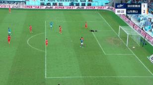 08月16日讯 中超第21轮,山东泰山3-1战胜深圳新鹏城。比赛中泰山门将于金永的一次失误,险些送给对方一粒进球。比赛第85分钟,于金永在禁区内将皮球放下后又重新抱起,二次触球违例送给新鹏城一个间接任意球,蒂亚戈-列昂索的打门被挡出底线。