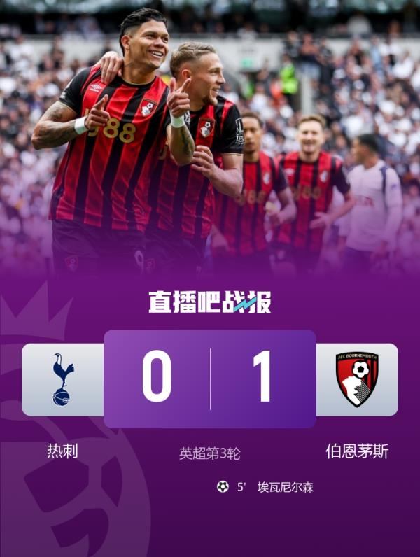 赛季首败!热刺0-1伯恩茅斯 埃瓦尼尔森闪击建功维卡里奥屡救险
